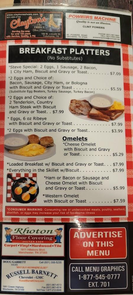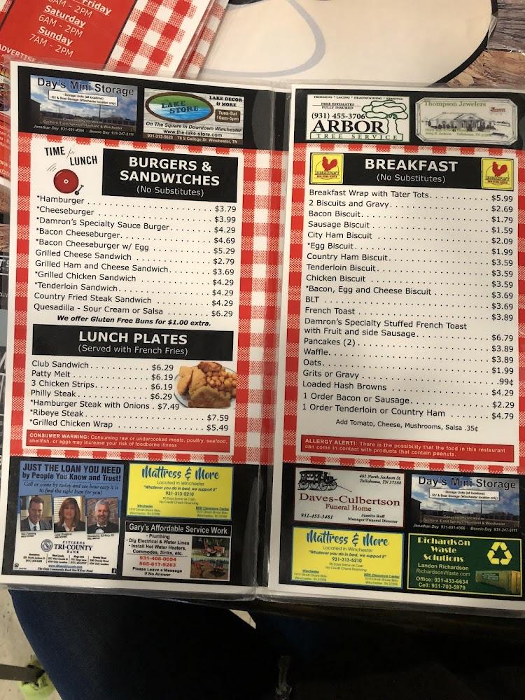 Welcome to Damron's Restaurant, a charming eatery located at 714 E Lincoln St, Tullahoma, TN. Known for its excellent coffee and a wide selection of teas, we specialize in serving delicious American breakfast, lunch, and dinner options at an affordable price range of $1-10. Our menu features simple, traditional dishes perfect for sharing, along with delightful desserts. Enjoy a relaxed ambiance, ideal for solo diners or groups. We offer convenient services such as dine-in, takeout, and delivery. With wheelchair accessibility and kid-friendly amenities, Damron’s ensures a delightful dining experience for everyone. Visit us today!
